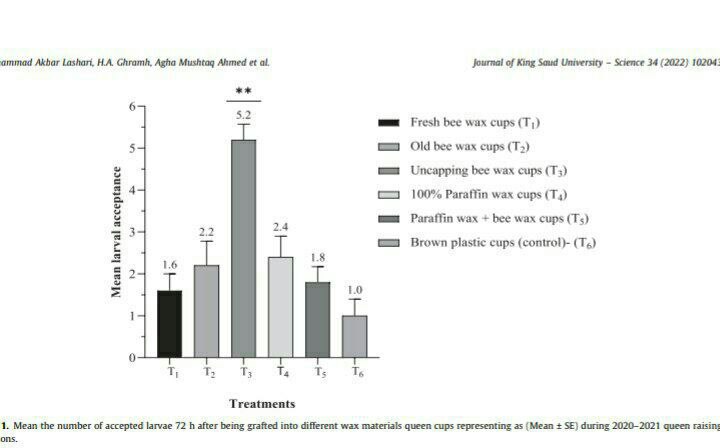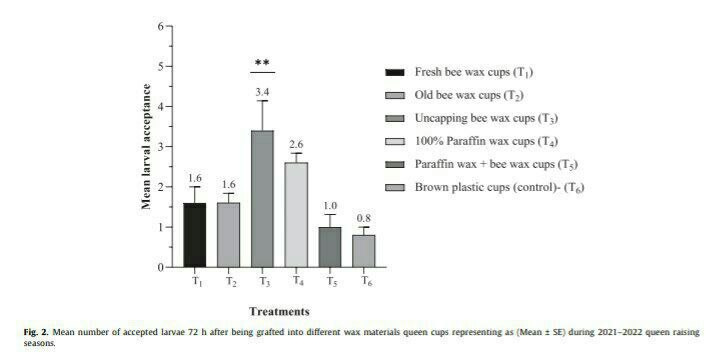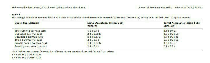 که چرا مواد مایع در پوش عسل در طول پرورش ملکه مفید هستند..در سلولهای پلاستیکی کنترل، میزان پذیرش لارو کم بود، در محدوده از 13.33 درصد و 12.00 درصد بوده علاوه بر این، Mattiello و همکاران. (2022) گزارش داده اند که اندازه فنجانک سلول ملکه ممکن است بر میزان پذیرش تأثیر بگذارد و مطابق آن لاروهای پیوندی و اندازه ملکه، ممکن است روی کیفیت کلنی تاثیر بگذارد. به نظر می رسد اندازه فنجانک های سلول تأثیر خوبی بر روی وزن و اعضای بدن ملکه ها زنبور عسل دارد. توضیح اینکه چرا سرپوش مومی زنبور ها به عنوان مواد پیوندی بهترین عملکرد را دارد ناشناخته است و باید در آزمایشات تحقیقاتی میدانی و آزمایشگاهی بیشتر مورد بررسی قرار گیرد. علاوه بر این، در محیط نسبتاً گرم و خشک، کلنی های سلول ساز (30 تا 35 درجه سانتیگراد)، موم درپوش ممکن است بیشتر از سایر موارد مورد علاقه زنبور باشد ، و زمان طولانی تری توسط زنبور عسل نسبت به سایر مواد تشکیل دهنده مورد استفاده و نگهداری قرار گیرد .در نتیجه، ممکن است زنبورها محصولات تولیدی خود را بیش از مواد دیگر مورد استفاد درپرورش ملکه ترجیح دهند. این یافته ها می تواند به زنبورداران محلی و پرورش دهندگان ملکه در به دست آوردن ملکه های قوی با کیفیت برتر از طریق بهترین تکنیک های زنبورداری کمک کند.در میان تمام مواد فنجانک های مورد بررسی برای تولید ملکه در این مطالعه، فنجانکهای مصنوعی سلول ملکه ساخته شده از موم زنبور عسل دارای بالاترین پذیرش لارو و تولد ملکه بودند. بر اساس یافته های این مطالعه، استفاده از موم زنبور عسل می تواند پذیرش لارو پیوندی را در طول پرورش ملکه افزایش دهد. مطالعات بیشتری برای ارزیابی فنجانک های ملکه از منابع مختلف مورد نیاز است، به ویژه که می توان از آنها برای افزایش تعداد زنبورهای ملکه پرورش یافته استفاده کرد. بر اساس یافته های این مطالعه، استفاده از موم زنبور عسل می تواند پذیرش لارو پیوندی را در طول پرورش ملکه افزایش دهد. مطالعات بیشتری برای ارزیابی فنجانک های ملکه از منابع مختلف مورد نیاز است، به ویژه که می توان از آنها برای افزایش تعداد زنبورهای ملکه پرورش یافته استفاده کرد. نویسندگان اعلام می کنند که هیچ گونه منافع مالی یا روابط شخصی رقیب شناخته شده ای ندارند که بر کار گزارش شده در این مقاله تأثیر بگذارد.